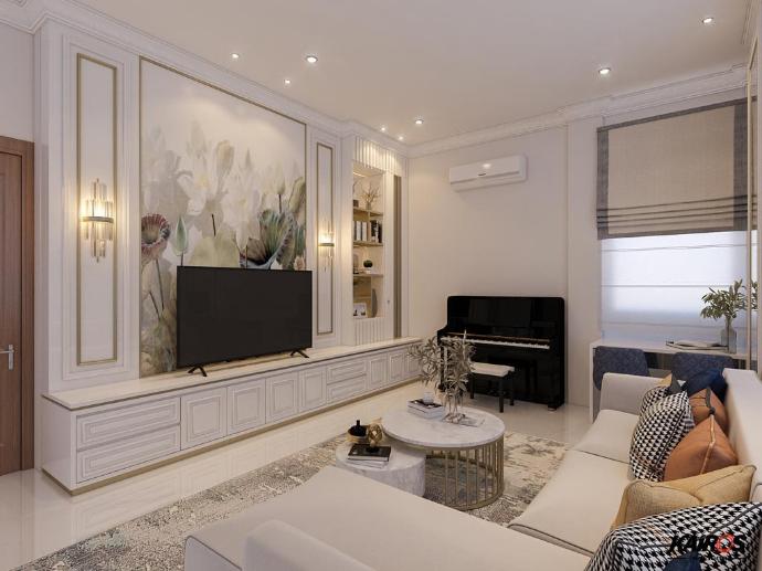 Gaya Modern yang lebih inovatif, menekankan pada suasana yang menggambarkan masa depan yang penuh dengan teknologi canggih. Biasanya material yang digunakan berwarna putih, perak, atau penuh dengan kaca serta garis-garis tegas.